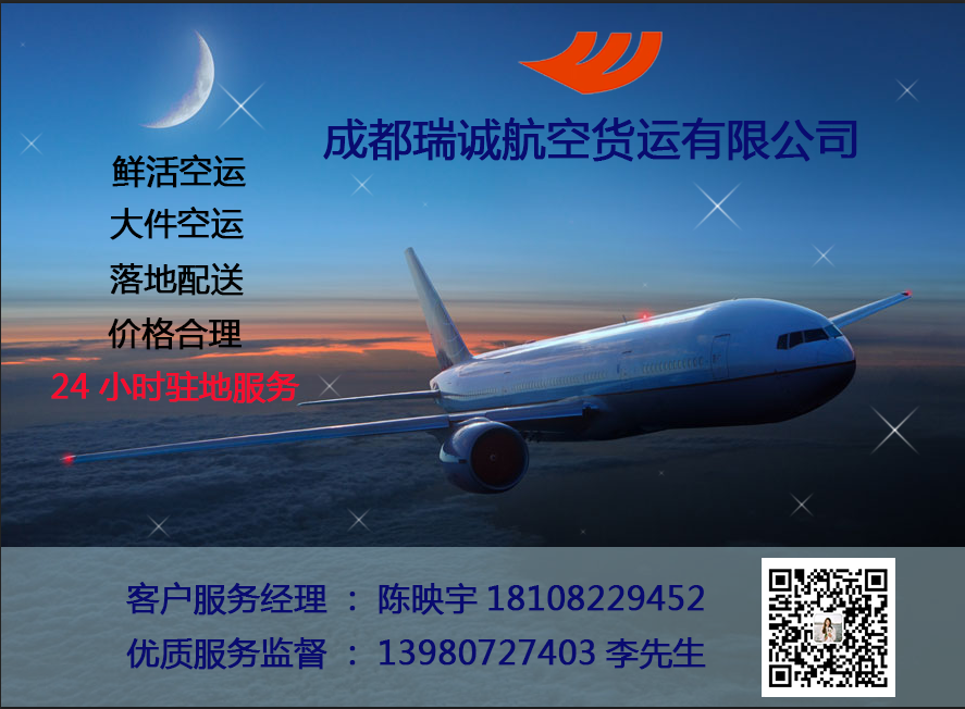 成都瑞诚航空货运有限公司承接全国航空快递运输业务,当天发,当天到,实效快。可以上门接货,可以送货上门!欢迎来电咨询。18108229452,8588-4680,8588-4670.地址:机场路常乐一段4号。(例如:投标书、身份证、户口簿、公司重要资料、犬、水果、礼品、仪器、工艺品、中高档酒水等等)急货主之所急,想货主之所想!成为客户忠实的贴心人!
